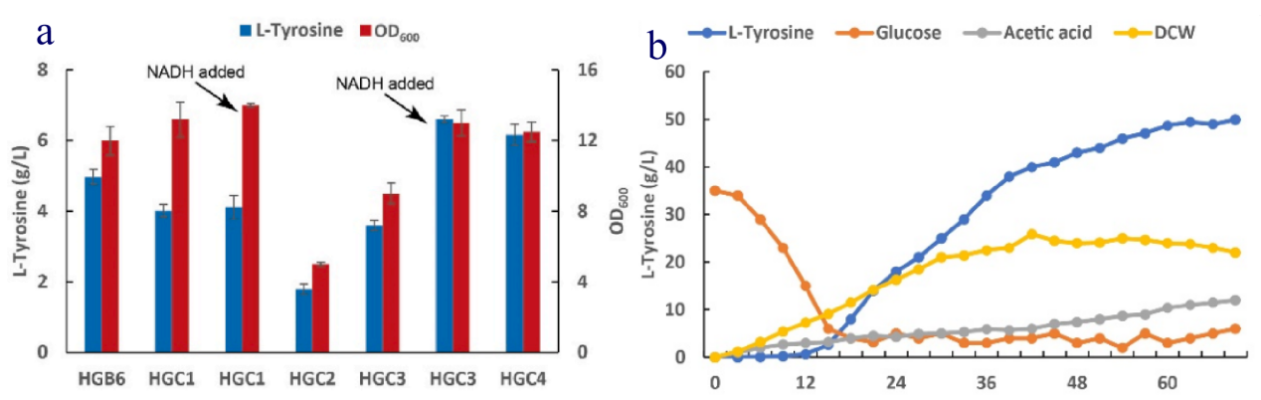 研究人员以大肠杆菌WSH-Z06作为起始菌株,对莽草酸和芳香氨基酸积累相关的几个基因进行过表达和敲除混合验证,得到一株联合4个基因过表达与3个基因敲除的菌株,48 h摇瓶L-酪氨酸产量达到4.22 g/L(图2 )。接着在其莽草酸途径中添加磷酸解酮酶途径(PK),发现菌株在摇瓶中的OD600提升了9.8%,但是整体的L-酪氨酸产量呈现降低趋势。整合2个NADH与NADPH互相转化的基因后,得到的菌株产量提升至6.17g/L(图3a)。将该菌株进行5L发酵罐水平的发酵,L-酪氨酸的产量达到50.2 g/L,同时在发酵液中检测到12.4 g/L的乙酸(图3b),高浓度乙酸导致了菌体生长被明显抑制(图3b)。